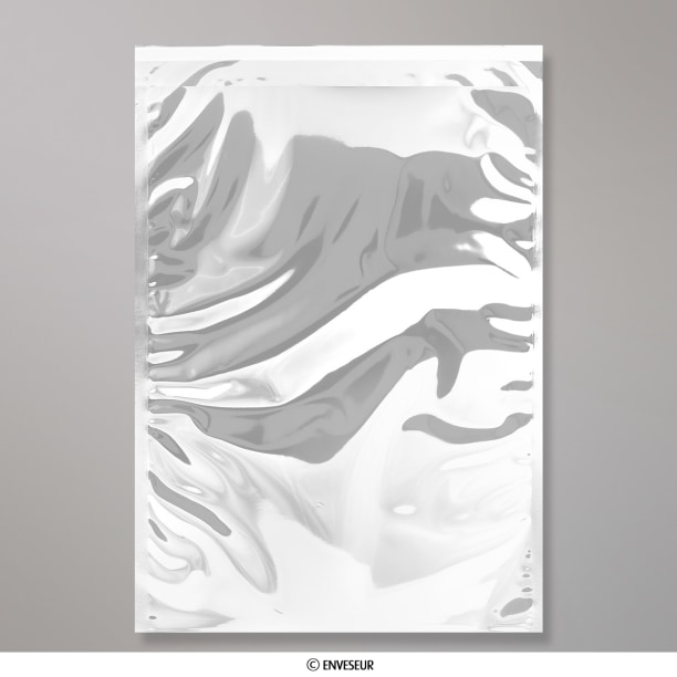 Código de produto: SN7S Sem aba (dentro): 450 mm Com aba (dentro): 320 mm Cor: Prata Acabamento: Metalico brilhante Estilo: C3 Formato: Bolsa Fecho: Banda Adesiva Material principal: Folha de prata Peso do material: 70 Mícrons Opacidade interna: Não Junções: Skirt Janela ou simples: Liso |